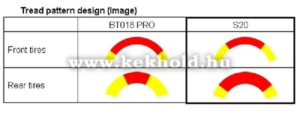 A Bridgestone MotoGP technológiája által inspirált prémium sportabroncs. A Bridgestone egy prémium sportabroncs bevezetésével bővíti motorabroncs-választékát: a 600-1300 cc nagyteljesítményű motorokhoz gyártott Battlax Hyper Sport S20-szal. Az S20 prémium motorabroncs, melynek nevében először használják az S-t a sportabroncs jeleként, kiegészíti a Bridgestone Hyper Sport termékcsaládját, melyhez többek között a Battlax BT-016 Pro és a BT-016 is tartozik. Az S20-at úgy fejlesztették, hogy megfeleljen az európai sportos motorosok igényeinek, akik kiváló irányíthatóságot várnak nedves és száraz viszonyok között és minden úttípuson: országúti túrázásnál, kanyargós hegyi utakon, városi utcákon és a versenypályán. A Bridgestone mérnökei a MotoGP-s tapasztalataikat hívták segítségül a tervezésnél. Az új S20 teszteredményei azt mutatják, hogy a Bridgestone sikeresen alkalmazza MotoGP-s technológiáját közúti abroncsok gyártásánál. Eddig az S20 a MotoGP abroncsokhoz legközelebb álló sorozatban gyártott abroncs, így bármely más abroncsnál többet hasznosít a Bridgestone MotoGP-s tapasztalataiból nyilatkozta Vincent Van Houtte, Manager Motorcycle Tyre Products, Bridgestone Europe. Nagyobb érintkezési felület minden szögben. A BT-016 Pro abronccsal összehasonlítva az S20 jobb irányíthatóságot biztosít nedves és száraz úton és rendkívül hosszú az élettartama. A Bridgestone jól bevált mono-spiral övtechnológiáját (MSB) és a nagy húzószilárdságú kordbetétet (High Tensile Super Penetrated Cord HTSPC) úgy optimalizálták, hogy nagyobb érintkezési felületet nyújtson minden szögben és így jobb tapadást biztosítson mindenféle körülmények között. Kisebb kerékdőlési szög esetén a nagyobb érintkezési felület kellemesebb érzetet ad és fokozza a vezetési kényelmet, közepes és nagy szögnél pedig javul a kanyarstabilitás. Az S20 futófelületét olyan kiegyenesedő központi mintaárkok alkotják, melyek fokozzák a kanyarodási képességet kisebb kerékdőlési szög esetén. Az első abroncson az oldalsó mintaárkok kifutnak az abroncsvállra, kellemesebb érzetet biztosítva nagy szögnél és nagyobb tapadást nyújtva nedves és száraz úton. A hátsó abroncs szélesebb mintaárkai biztos tapadást nyújtanak nedves úton. Az S20 nagy érintkezési felülete és tapadása MotoGP-s génjeinek köszönhető. A sportos vezetők teljes biztonsággal vehetik a kerékdőlési szögeket nyilatkozta Dominique Plom, Assistant Manager, Field Engineer, Bridgestone Europe. Azonnali tapadás. A szilíciumban gazdag és a Bridgestone által szabadalmazott NanoPro-TechTM polimerrel dúsított új gumikeverék, mely csökkenti az abroncs forgása közben fellépő hőfejlődést, fokozott tapadást biztosít nedves úton és alacsony hőmérsékleten. Így biztonságos tapadás érhető el már a hideg gumi esetében is anélkül, hogy csökkenne akár az első, akár a hátsó abroncs futásteljesítménye. Egy lágyabb és egy keményebb keverékből optimálisan rétegzett háromrétegű gumikeverék (3LC) található az első és a hátsó abroncsban is, mely fokozza a tapadást száraz úton, valamint jó kanyarstabilitást és futásteljesítményt biztosít. Új nedves tapadási rekord. A Bridgestone BT-016 Pro-val összehasonlítva a teszteredmények azt mutatják, hogy az új S20 fokozott tapadást nyújt száraz úton, jobb kanyarodási képességet és kiváló sportos irányíthatóságot biztosít. Versenypályán nagy kanyarstabilitást és gyorsabb köridőt tesz lehetővé az első és hátsó abroncs jobb és kiegyensúlyozottabb tapadásának köszönhetően. A Bridgestone tesztjei azt mutatják, hogy az S20 nedves tapadása még a ma már szabványnak számító BT-016 Pro abroncsénál is jobb. Az eredmények a fokozott tapadásból fakadó kiváló stabilitást is igazolják, mely könnyű irányíthatóságot biztosít szakadó esőben is. A fokozott tapadás nem megy a futásteljesítmény rovására. A Bridgestone tesztjei igazolták, hogy az új S20 gumikeverék rendkívül kopásálló, nagy futásteljesítményt téve lehetővé mind az első, mind a hátsó abroncsnál. Az új prémium Battlax Hyper Sport S20 2012. januártól kapható Európában négy első abroncs és hét hátsó abroncs méretben. A felnik és egyéb kiegészítők a képeken csak illusztrációk. Motorgumi vásárlás esetén a megrendelt fajtájú és darabszámú árút szállítjuk. Az árak csak egy darab motorgumira érvényesek, kivétel, ha ezt külön feltüntetjük.