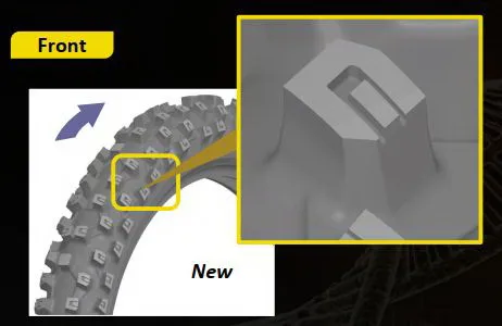 Az első gumiabroncs tömbjei patkómintázatával csökkentik a gumiabroncs közepén a merevséget.  A patkótömbök egyedi mintája elősegítik az öntisztulást , így jobb fékezési tapadást biztosítanak.
